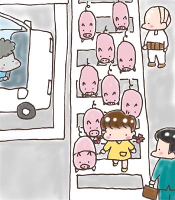 昨日は、コミコミ女学園の入学式だった。 えんれ〜べっぴんさんばっか集まってた。 オラがたの村から通うのはすんごいてえへんだ。 木炭車で片道2時間はゆうにかかるけん。 ま、村の学校が廃校になったからしょうがなか。 これも社会勉強だな。 この学校でいろんな人と知り合って、 いい米や野菜づくりのヒントにしてえ。 へこたれずがんばるだ。 「ピ〜スケ」ば、教室に連れて入ろうと したら、先生に怒られた。 ブタは綺麗好きなんだけんどな。