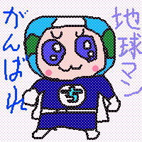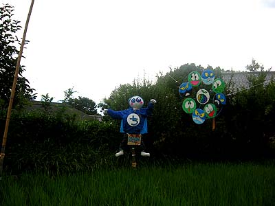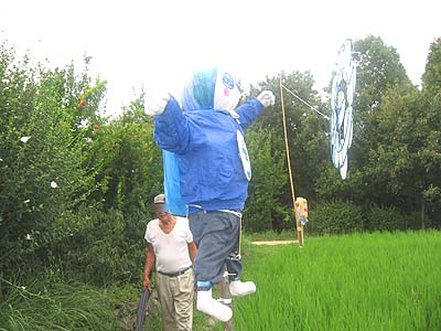 (2009/9/5) 大阪市立環境学習センター「生き生き地球館」にて 「がんばれ!地球マン」の4コマ漫画を 常設展示(定期的に展示を増やしています)して いただいているのですが、 それを見た小学生のみなさんが「生き生き地球館」の 田んぼに地球マンかかしを作ってくれました。 びっくり! |