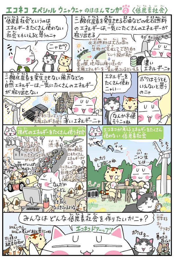 低炭素社会への移行(いこう)が人類(じんるい)の重要(じゅうよう)な課題(かだい)となりつつあるのニャ。